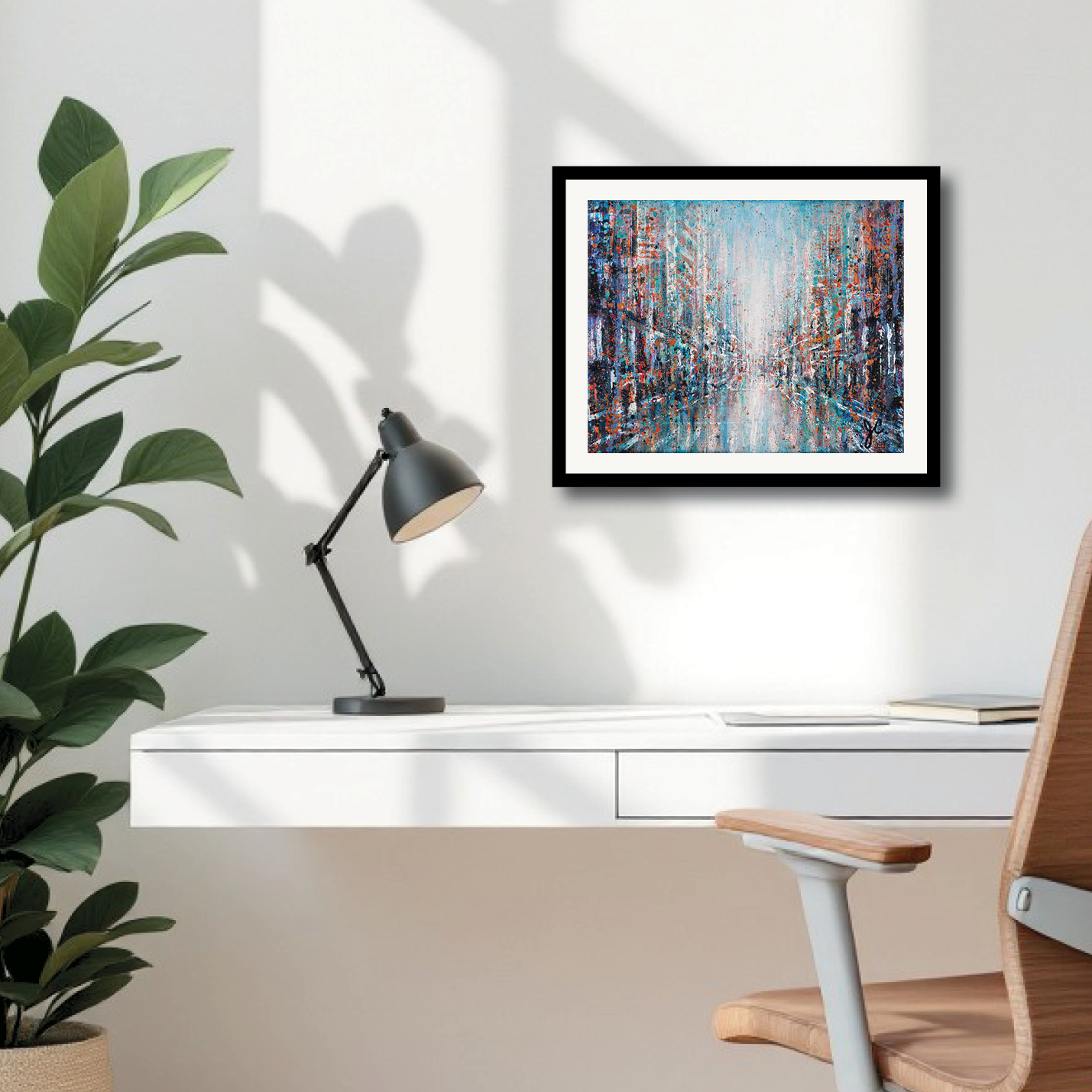 Note : les proportions de l’œuvre dans la simulation de décor présentée ci-dessus sont approximatives. Il recommandé de vous référer aux mesures de l’œuvre pour vous assurer que ça convient. Pour une simulation précise, vous pouvez recourir à mon service de visualisation.