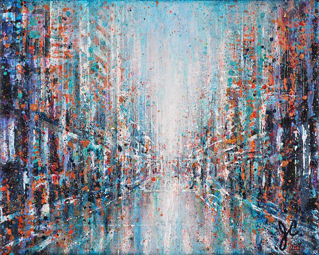 Dans cette œuvre, la ville semble se dissoudre dans la lumière. Les contours s’adoucissent, les lignes se fondent, et l’instant devient presque immatériel. La scène évoque la fragilité de ce qui passe, comme un souvenir suspendu entre réalité et rêve. Le mot Évanescence vient du verbe s’évanouir, au sens de disparaître peu à peu. un mot très délicat, presque sensoriel qui décrit la fluidité que ce tableau dégage.