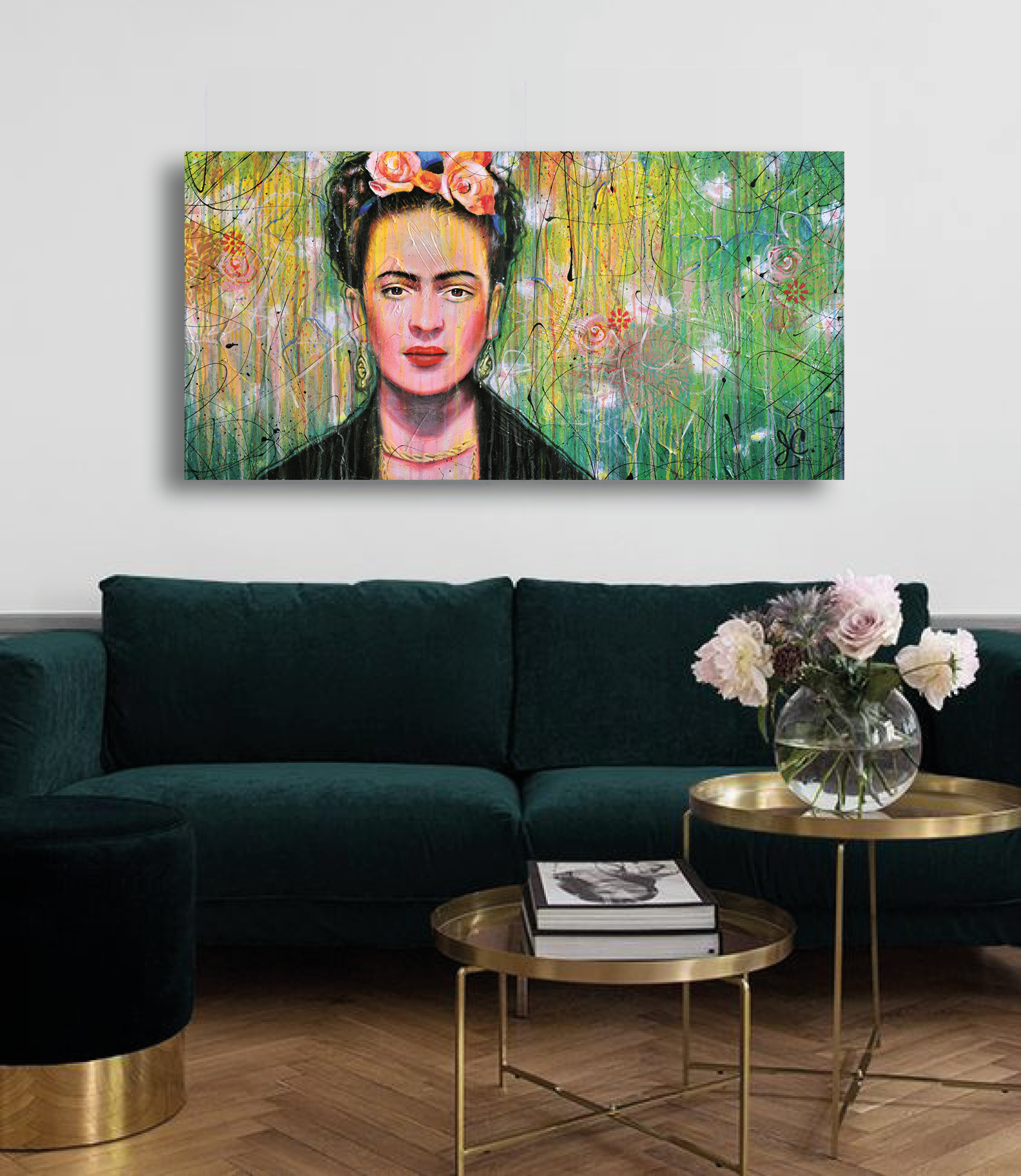 Le fond explose en verts vibrants et en éclaboussures spontanées qui dansent autour d’elle pour apporter du mouvement. Les fleurs dans ses cheveux apportent une douceur qui contraste avec son regard direct et ancré. Les textures brutes et le dripping ajoutent une dimension contemporaine à cette figure historique.