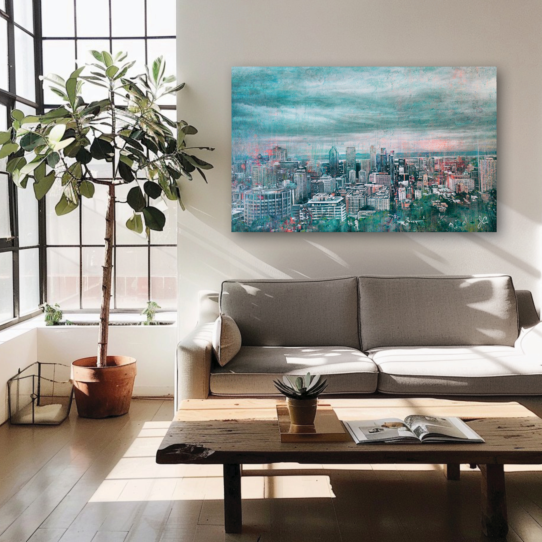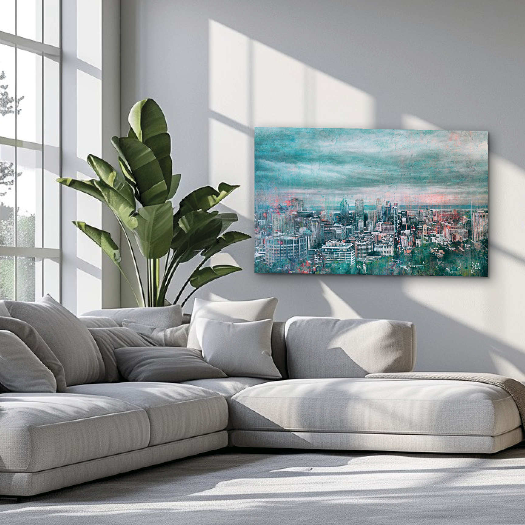 Note : les proportions de l’œuvre dans les simulations de décor présentées sont approximatives. Il recommandé de vous référer aux mesures de l’œuvre pour vous assurer que ça convient. Pour une simulation précise, vous pouvez recourir à mon service de visualisation.
