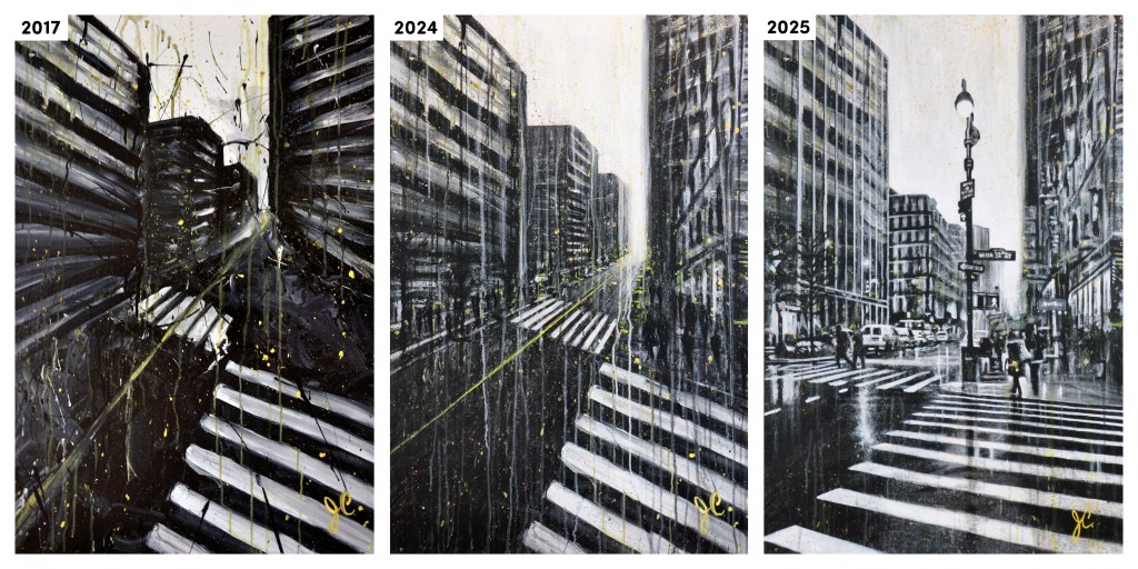 Voici l’évolution de l’œuvre au cours des années. La première version était une pratique de compétition de peinture, je l’avais fait en 20 ou 25 minutes. Ce qui explique les coups de pinceaux très brut et moins précis.