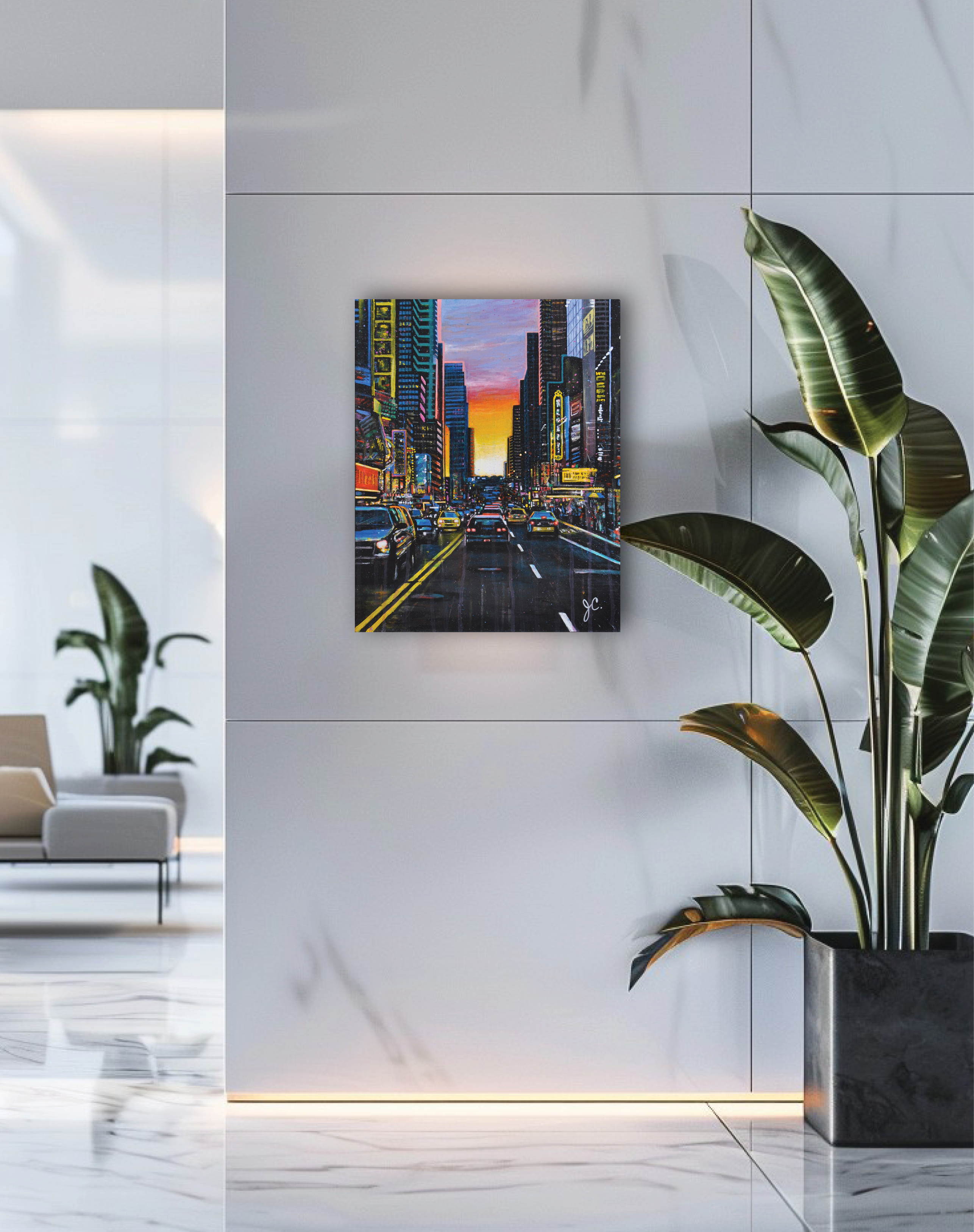 Note : les proportions de l’œuvre dans la simulation de décor présentée ci-dessus sont approximatives. Il recommandé de vous référer aux mesures de l’œuvre pour vous assurer que ça convient. Pour une simulation précise, vous pouvez recourir à mon service de visualisation.