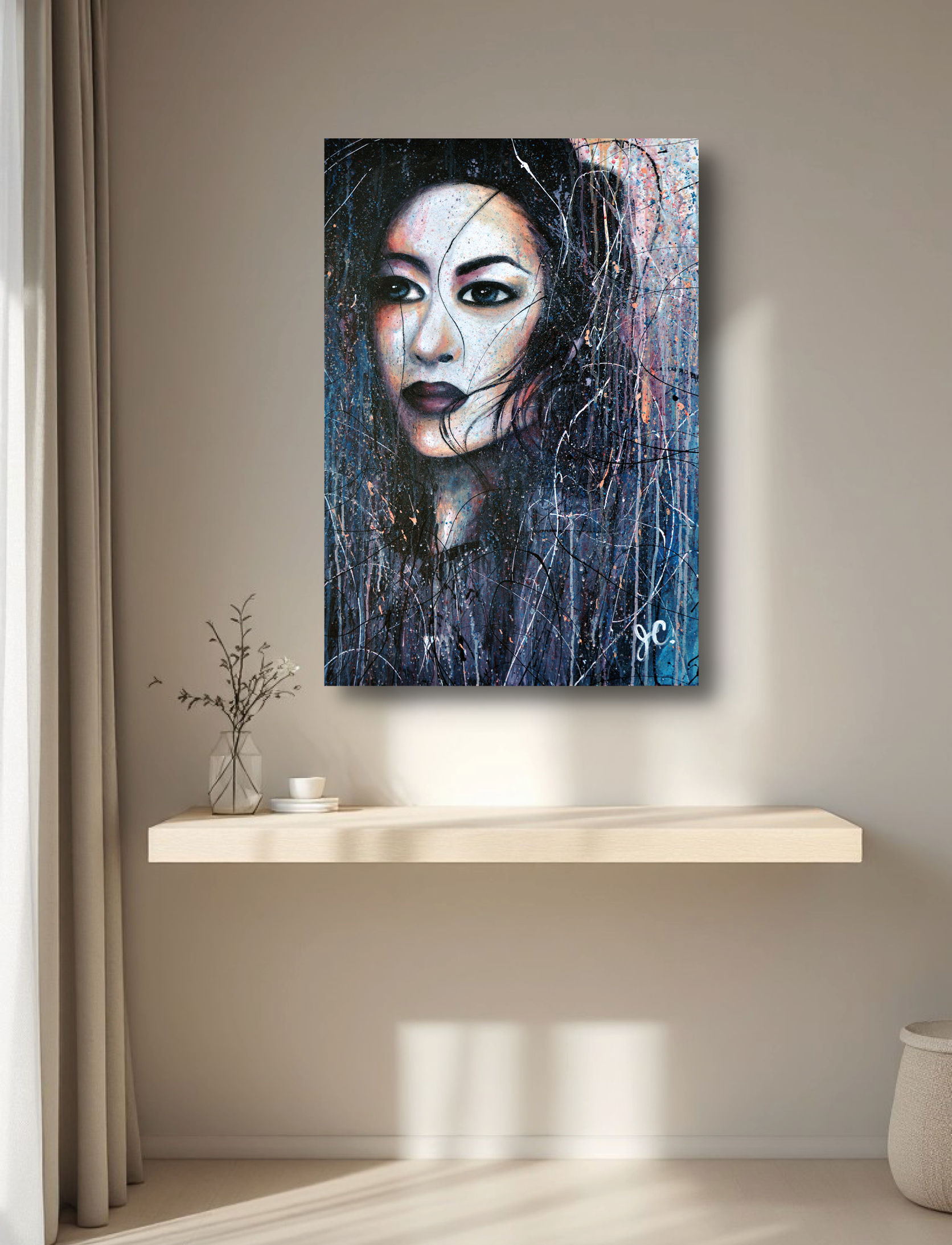 Sur un fond abstrait où se mêlent des touches de bleu profond, de violet et de pêche lumineux, la matière coule librement. Le dripping laisse des traces spontanées, instinctives, comme si l’émotion suivait son propre chemin. Ses cheveux volent au vent. Ils ne sont pas figés. Ils s’élèvent, porteurs d’élan et de liberté.